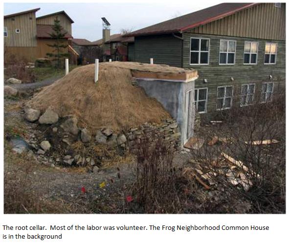 A few years back residents of EVI built a small root cellar with help from local college students who were doing a community service course. In 2009 a resident started up a winter produce Community Supported Agriculture co-op. In Community Supported Agriculture programs generally the customer purchases a share in the upcoming harvest, guaranteeing the farmer a certain income and guaranteeing the purchaser a certain price in advance. By October many farms are storing the excess harvest that comes in towards late summer. Many local farms in upstate New York have invested in their own root storage facilities and thus have substantial amounts of food for sale. The winter produce CSA allows residents who aren't growing and storing their own winter crops to purchase at prices averaging about 30% below retail. In 2010, twenty-one families signed up for a total of 1,500 pounds of beets, onions, carrots, cabbages, potatoes, rutabagas, celeriac, parsnips and turnips, from five local organic farms. A total of $1,736 was invested by consumers who made pickups every two weeks from January through March. Customers were guaranteed fresh organic crops while the CSA manager paid herself for the twenty-plus hours of bookkeeping and organizing work with a small free CSA share. Customer payments covered the costs of the roots and the transportation. Consumers could work two hours total on one of the distribution days, or pay a $15 dollar fee and not work. No other charges or costs were involved. The lowest household investment was $14, while the largest purchase totaled $134. In 2011 signups are down to fourteen households, just enough to make the operation a break-even. This perhaps indicates one of the main vulnerabilities of small-scale co-ops: they easily fall prey to sudden collapse, like other small businesses. Root vegetable co-op founder and manager Katie Creeger speculates that the drop in participation results partly from the expanding community gardens; more ecovillagers are growing their own food and storing it in private household root cellars that are relatively easy to construct. Some may also have shifted to larger co-ops in the region that can offer a wider range of choices.